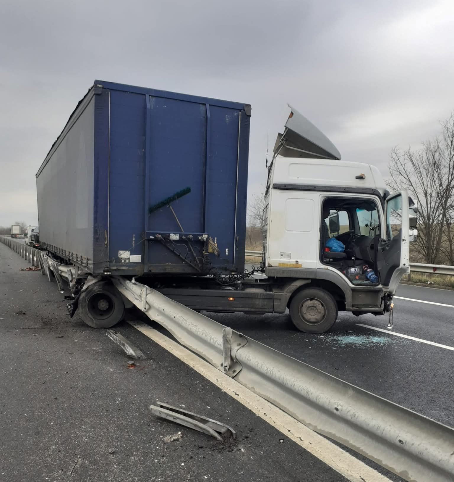 În urma impactului, au fost produse avarii la cele două autotrenuri și nici o persoană nu a fost rănită.